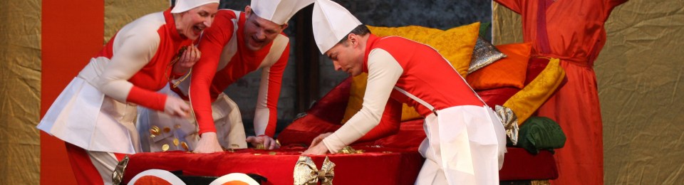 Er hasst Mitleid, doch er liebt den Applaus. Noch mehr versteht es der reiche venezianische Geizkragen Volpone (grandios: Olaf Nilsson) andere hereinzulegen, um noch mehr zu ergattern und zu glänzen. Listreich spielt er den Todkranken, sobald die habgierigen Nachbarn und Erbschleicher bei ihm auftauchen, zitternd und röchelnd auf edlen Polstern auf dem Rollenbett liegend und die geschenkten Goldstücke rasseln wie Herzschläge an seinem Ohr. Volpone hält die um seine Gunst Buhlenden zum Narren, verspottet und verachtet sie – ehrliche Schufte wären ihm lieber! – zugleich für ihre Geldgier und Heuchelei und bringt sie erbarmungslos gegeneinander auf. Seine drei gewitzt-gerissenen Diener (Carola Pohlan, Jens Döring und Jan Dietl), genannt die Schmeißfliegen, mit spitz pastoralen Hüten helfen ihm überall schmarotzend bei seinen immer neuen, hinterhältig-boshaften Streichen.