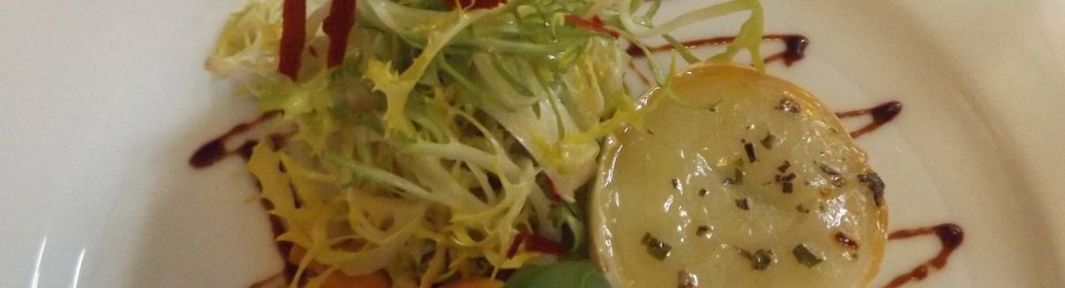 VorZIEGLich, nicht nur als Wortspiel, ist auch die Vorspeise – Ziegenkäsetürmchen mit Kräuterhonig, Frisee und Erdbeerpaprikaeis, letzteres gewöhnungsbedürftig, aber auch so gewollt der Kontrast von warm und kalt, etwas bitter und süß. Dazu gibt es knuspriges Weißbrot mit Karotten- und Walnussstücken und einen Rosé Cuvee.