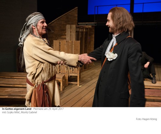 Zwei Erzähler (Holger Uwe Thews und Sophie Lüpfert) betrachten mitfühlend die kühne und gefahrenreiche Mission Mühlenbergs. Den Delawaren-Häuptling Fliegender Pfeil spielt Publikumsliebling Gojko Mitic, der würdevoll, weise, schelmisch und nachdenklich den Glaubens-Streit der lutherischen „Streithähne“ verschiedener religiöser Sekten und Anfeindungen gegen die indianischen Ureinwohner zu befrieden sucht. Auf der Hochzeit seines Freundes Mühlenberg überreicht er dessen Frau Anna Maria (als schöne und kluge Ratgeberin und Mutter: Julia Rani) eine indianische Perlenkette. Im Schlussbild klopfen Flüchtlinge in orangenen Rettungswesten ans Holzhaus der deutschen Einwanderer. Begeisterter Beifall für einen ergreifenden Theaterabend. Mit dem Stück gehen die Landesbühnen auch auf Tour in mehreren Bundesländern und wollen es außerdem in diesem Jahr am einstigen Wirkungsort von Mühlenberg in Pennsylvania aufführen.