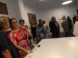 Galeristin Ines Schulz (2. v.li.) im Gespräch mit einer Besucherin in der Ausstellung.