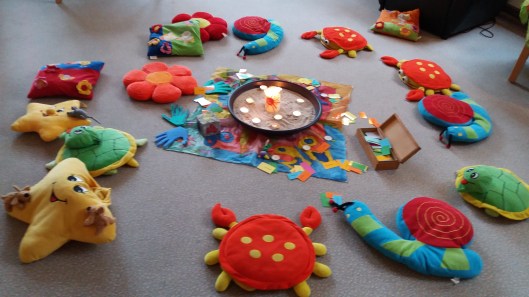 Die Sonne scheint durchs Fenster. Ein großer Sommerblumenstrauß steht auf dem Tisch in dem hellen, gemütlichen Raum. Einige Kinder in der Runde kennen sich schon, andere sind neu. Sie sitzen auf lustigen Tierkissen im Kreis. In der Mitte leuchtet eine weiße Kerze im Sand. Ein grauer, bunt bemalter Stein mit Smileys und anderen Symbolen wandert reihum.