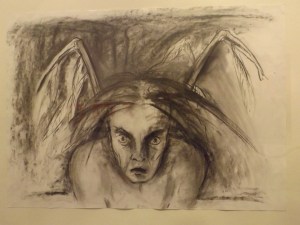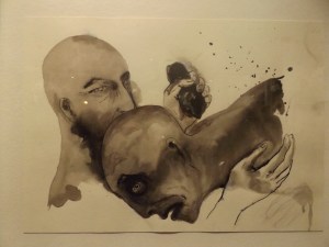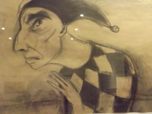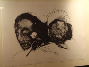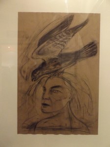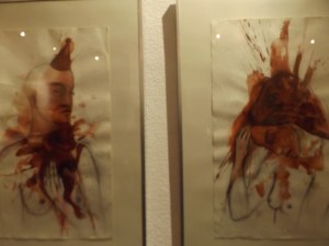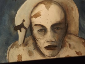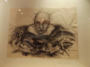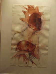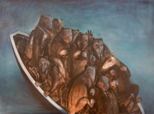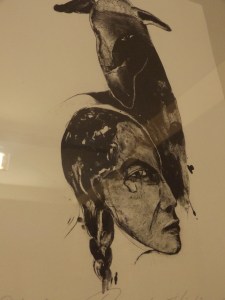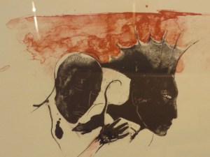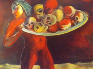 ZU sehen sind Malerei, Zeichnungen und Druckgrafik vorwiegend aus den letzten zwei Jahren. „Keiner will mehr Verantwortung übernehmen“, sagt Angela Hampel zum Symbol mit dm sinkenden Schiff, das folgt man der Bildperspektive Kurs auf uns selbst nimmt. Da kommt der Sensenmann als „fröhlicher Landmann“ (mit Feuer im Bauch) vor gelb leuchtendem Rapsfeld schalkhaft grinsend daher, trägt eine rote Frauengestalt im Bild „Traurige Ernte“ ein Tablett mit Totenköpfen statt saftiger Äpfel. Zeigt die Malerin sich selbst mit Bezug auf ihren Namen als „Gerupften Engel“ mit versengten Flügeln und in einer Selbstporträt-Serie „Selbst mit Masken der Selkman“, wie sie einst die Feuerlandindianer bei ihren Initionsriten trugen, bevor sie von europäischen Missionaren ausgerottet wurden.