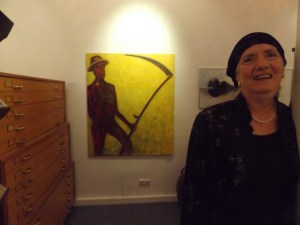 der Sensenmann als „fröhlicher Landmann“, davor Malerin Angela Hampel