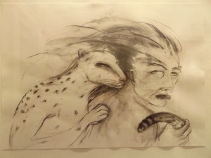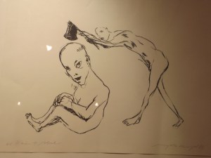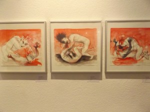 Mal fühlt sie sich wie „In der Schlangengrube“ umgeben von Schrecknissen, Leid und Bedrängnis. Gewaltvolle Szenen in expressiven schwarz-roten Farbtönen wie der Brudermord von Kain und Abel, dargestellt auch in einem frühen Blatt von 1984, tieftraurige Clowns und die drei Heiligen Könige mit Gewehrgurten, ein schwarz eingefärbtes Lamm Gottes und ein Triptychon „Memento mori“, das eng verschlungene, tote Mensch- und Tierüberreste zeigt, wechseln sich ab mit innigen, zarten und kraftvollen Frau-Tier-Bildern. Die Frauen werden begleitet von Gepard, Rabe, Falke, Fisch, Fasanen (asiatisches Liebes- und Glückssymbol), Wolf und Schwan und beschützen sich gegenseitig. Ihre nächste Ausstellung würde sie „Rot sehen“ nennen, sagt Angela Hampel. Hoffentlich ist bis dahin nicht alles zu spät!