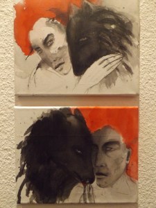 Schwarz sehen – eine dunkle Vorahnung haben, Unheilvolles befürchten für eine Entwicklung, die nicht mehr aufzuhalten ist. Wut und Schmerz, Liebe und Tod, Düsternis, Verletzlichkeit, aber auch viel Schönheit, Sinnlichkeit, Kraft und Mut weiterzugehen in diesen rauen, konfliktreichen Zeiten, wo selbst der Kasper flieht mit schreckweiten Augen, die Ratten in edlem Zwirn das sinkende Narrenschiff verlassen, zeigt die Malerin Angela Hampel in ihrer derzeitigen Ausstellung „Schwarz sehen“ in der Galerie Mitte auf der Striesener Straße 49/1. Etage, in Dresden.