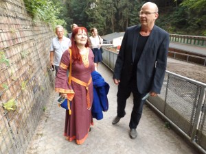 Buchautorin Sabine Ebert und Landesbühnen-Intendant und Regisseur Manuel Schöbel auf dem Weg zur Premiere von „Das Geheimnis der Hebamme“ auf der Felsenbühne Rathen. Foto (lv)
