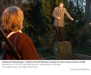 Karl May (gespielt von Holger Uwe Thews) ist an diesem Abend im Karl May Museum unterwegs. Seine Romanhelden Winnetou und Old Shatterhand (beide dargestellt von Jürgen Haase) gehen mit ihm ins Gericht und hinterfragen viele seiner Ideen. Eine amüsante Begegnung und ein absolutes Muss für alle Karl-May-Fans, die diese zwei Abende während des Radebeueler Bilderbogens noch nicht erleben konnten.
