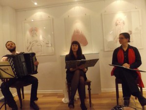 „Wie Perlen auf einer Schnur“: Vor den filigran-sinnlichen Bildern der Künstlerin Fides Linien, die dem Betrachter Rätsel aufgeben, woraus die zarten, erdfarbenen und pastellfarbenen Linien auf handgeschöpftem Papier bestehen, gab es in der Ausstellung „Venus`Flor“ eine Lesung mit Solvig Frey und Kristin Rudloff. Passend zu den buchstäblich umgarnenden Figurenwelten mit mythischen und modernen Frauengestalten, lasen sie abwechselnd ebenso lustvoll, feinsinnige, versponnene Geschichten von Frauen. Von Elke Heidenreich bis Sybille Berg, über Glücksmomente wie Perlen, nackte Gier, die Launen der Liebe, Sehnsucht und Kunst, die wilde Muse. Klangreich von Bach bis Piazolla, Walzer und Muzette, begleitet von Danny Leuschner am Akkordeon.