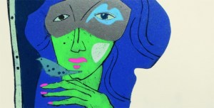 Frau mit Maske“, Michael Hofmann, 2019, Farbholzschnitt