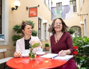 Genussvolle Leichtigkeit des Seins: Galeristin Janett Noack und meinwortgarten-Inhaberin Lilli Vostry vor der Galerie Kunst & Eros in Dresden, die gerade ihr 10-jähriges Jubiläum feierte. Foto: © Steffen Füssel