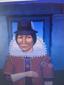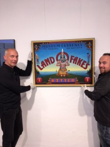 Robin Leipold: In der Ausstellung werden neben Gemälden, Grafiken, Drucken, Fotografien und Skulpturen auch Videokunst präsentiert. Die indigenen Künstler sind alle mit der amerikanischen Popkultur aufgewachsen. Jahrzehntelang wurden stereotype Bilder über Indianer in Filmen und Werbung benutzt und jetzt kehren sie dies um und indigenisieren selbstbewusst und ironisch die Popkultur der heutigen Zeit. Die Blicke und Bilder wechseln. Der indianische Humor ist ohnehin stark, der sich auch aus populären Comics oder den Star Wars-Filmen speist. Das spiegeln Bilder wie „Indigenous Hulk“ von Steven Paul Judd oder das reklameartige, symbolistische Bild „Land O Fakes“ von David Bradley, das eine Weiße mit Maske im Indianerkostüm zeigt. Bis hin zur Videoinstallation, in der ein Künstler als eine Art Drag Queen in Frauenkleidern auftritt in einer Liebesszene mit Winnetou, die Karl-May-Filme böse persiflierend. Die indigenen Künstler setzen sich aber auch mit sozialen Nöten, Diskriminierung und Umweltschutz auseinander, mit den Wurzeln ihrer Kultur und ihrem Leben als Indianer im 21. Jahrhundert.
