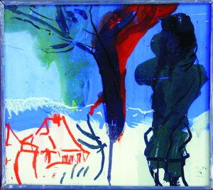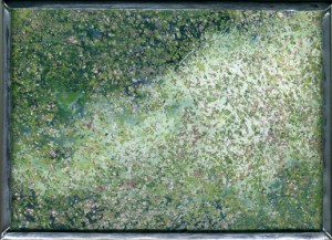 War mal eine Zinkplatte. Nützlich für Radierungen, Kaltnadel, Verni-mou-Ätzungen usw. War mal eine Glasplatte, sagte: „Das kann ich auch.“ Grundierung, Kaltnadel, Farbaufträge mit Pinsel und Feder, Auswischungen. Wieso denn das? Zufall? Anfang der 70-er an der Akademie in Düsseldorf. Seither sind wir eine lebenslange Freundschaft eingegangen: die Glasplatte und ich. Verkehrt herum und deshalb in großer Freiheit. Im Einvernehmen mit der Radierung und dem Holzschnitt. Dem Reichtum die Kehrseite.
