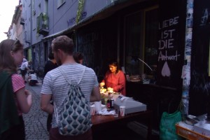 Musikalisch und mental geht`s bei der Sinnsuche um mehr als das persönliche Glück rasant bergauf und ab in diesem neuen Programm. Auf die Bühne kamen neue und ältere Texte, von unterhaltsamen Gags bis zu bissiger Sozialsatire, gewürzt mit feurigen und schmissigen Liedern und Tanzeinlagen von Rap bis Tango des Autorenduos Michael Frowin und Philipp Schaller u.a. Autoren unter Regie von Mario Grünewald, klangreich begleitet von Jens Wagner und Volker Fiebig an Piano und Schlagwerk. Darauf stimmt ein Medley aus romantischen Volksliedern, Schlagern und Kampfliedern ein von „Vorwärts und nicht vergessen…“ bis „Bella ciao“ und „Dieser Weg wird kein leichter sein…“ Gründe zu fliehen gibt es viele, vor dem steigenden Mietenwahnsinn, sozialer Ungerechtigkeit bis zu islamophoben und radikalen Mitbürgern. In der Hütte, mit nur einem Doppelstockbett für drei Pilgerer, prallen ihre sehr verschiedenen Lebensvorstellungen aufeinander vor karg gezeichneter Kulisse