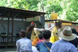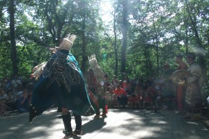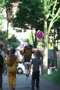 Die Clowns stellen naive Fragen, was ein mündiger Bürger eigentlich ist und darf, sie ziehen rückblickend mit zu den Demos auf der Prager Straße, klopfen mit den Zeitzeugen gemeinsam rhythmisch-kraftvoll auf den Boden und stellen sich mit den festgenommenen Demonstranten mit Händen und Füßen zur Wand. Und sie erleben, wie weh Kompromisse tun können, damit es demokratisch bleibt.