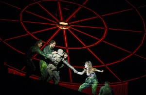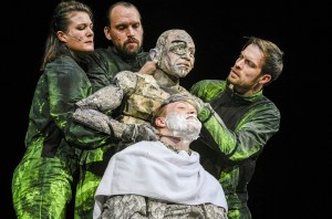 In einer Mischung aus Schau- und Puppenspiel und Videosequenzen kam „Woyzeck“ auf eine Drehbühne, die an ein Bergwerk erinnert, mit höhlenartiger Behausung, in der man nur gebückt gehen kann und einer Hängematte zum Sitzen und Liegen. Darüber hebt und senkt sich bedrohlich ein roter Vorhang-Krater (Bühne: Julia Kurzweg). Die anfangs archaischen, leisen Klänge und Gesang, die das Geschehen begleiten, steigern sich im Laufe der Aufführung laut, grell, ekstatisch, eindringlich und unheimlich zugleich (Musik: Anton Berman). Drei Darsteller in grün-schwarzen Militäranzügen führen eine lebensgroße Woyzeck-Puppe mit Stirnlampe am Kopf und richten ihn auf einer Metallpritsche auf. Er hat sich für ein medizinisches Experiment bereiterklärt, für ein paar Pfennige seinen Körper verkauft. Ein halbes Jahr lang nur Erbsen zu essen bekommen und nun schaut eine Kommission aus Wissenschaftlern, was mit ihm passiert. Der Arzt (absurd-komisch: Torsten Ranft) regt sich auf, dass Woyzeck wie ein Hund auf die Straße pinkelt. Auf Befehl kann er nicht. Die Kultur soll ihn fähig machen, seinen Willen zu behaupten, poltert er.