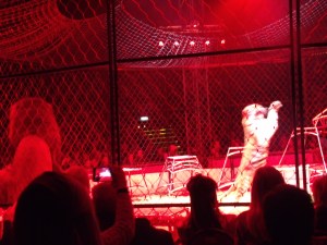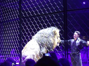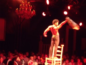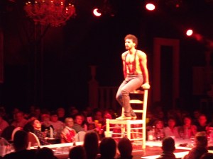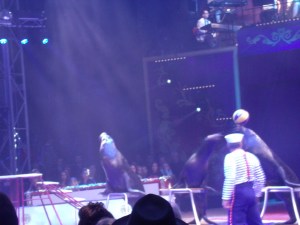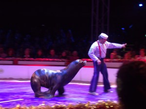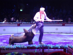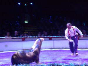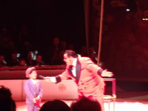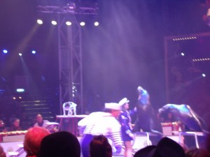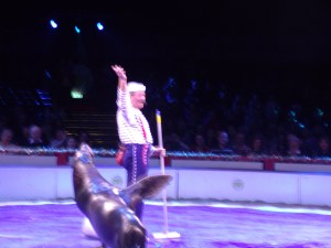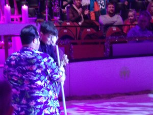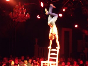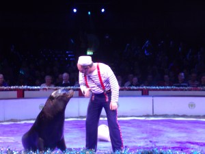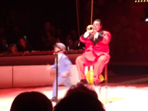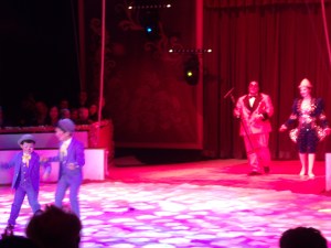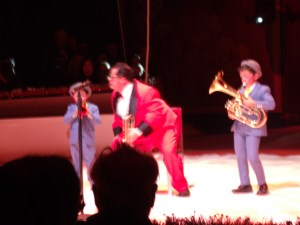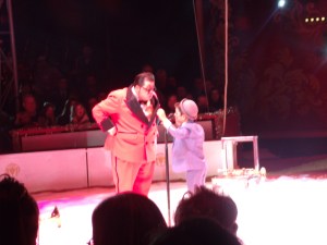 Zum Schluss trat Clown Totti Alexis auf, seit Jahren der Publikumsliebling des Dresdner Weihnachts-Circus und immer für eine Überraschung gut. Diesmal sang er zunächst gefühlvoll ein französisches Chanson und zeigte sich als nachdenklicher Clown. „Wir spielen im Dunkeln und strecken die Arme nach oben zum Unerreichbaren…“, sagte er.