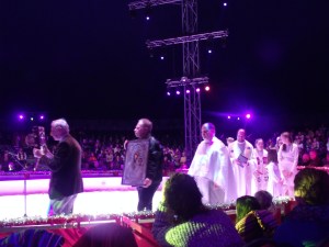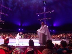 Gerade waren sie in Schottland auf Tournee, erzählt er. Manchmal habe er Zukunftsängste und Zweifel, auch um seine Kinder und ihren Glauben und wie es weitergehe, so Totti. Er vertraute sich einem befreundeten Pfarrer an, betrachtete den Sternenhimmel erstmals wieder seit langem und atmete frisch durch. Am nächsten Tag bereits waren einige Probleme gelöst, erzählt Totti. Jedes Mal, wenn er einen Moment innehielt und zuließ, dass die Welt ihn umspielt, spürte er, dass eine unsichtbare Hand ihn führt. „Die Welt ist voller Wunder. Genießen wir sie doch. Gott ist die Erde unter unseren Füßen, die Luft, die wir atmen und die Liebe, die wir spüren.“ Berührende Worte eines Clowns (der ganze Text steht unter http://www.facebook.com/clowntotti/posts). Zu ihm gesellten sich seine zwei Söhne Charlie und Maxim, die wie er ungeschminkt mit Wanderstab und Triangel am Manegenrand nah am Publikum entlangliefen und diesem zusammen mit ihrem Vater Totti fröhlich zuwinkten.