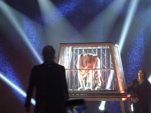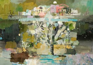 Eine wundersame Gestalt in einem Papierkleid, aus deren Kopf Zweige wie Antennen, Fühler wachsen, steht im Eingangsraum der Stadtgalerie Radebeul. Die „Baummuse“ ist umhüllt von Zeitungsseiten und übersät mit Gedichtversen in schwarzer Tusche, die Natur und Menschsein in aller Fülle, Schönheit und Abgründen zeigen. Hinter ihr an der Wand wirbeln Farben und Formen heftig durcheinander in der Collage-Serie „Chaoszeit“ aus dem Jahr 2014, daneben leuchtend farbig über schwarzen Umrissen