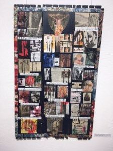 Licht und Schatten, Glück und Leid, Hunger, Gewalt und lautes Schweigen liegen nah beieinander in diesen Bildern aus aller Welt, zusammengesetzt aus Zeitungsausschnitten, die die „Unerreichbarkeit des Paradieses“ vor Augen führen und zugleich ein achtsames Erinnern daran sind. In einer Ecke liegt ein Stapel alter Zeitungen und Bücher als gesammelte „Zeitpäckchen“. Die wunderbare Collage „Tundra“ in grünen und erdigen Tönen, als Malgrund dient eine vergilbte Schulwandkarte, mit einem durch die weite Steppe im Rentierschlitten fahrenden Paar entführt in eine Welt, wo noch die Natur den Lauf des Lebens bestimmt. Am Treppenaufgang zum oberen Galerieraum wirft die Künstlerin ihre reichhaltigen Ideen- und Gedankennetze aus, die an einer Pinnwand festgehalten als „Kleine Zeitsammlung“ voller Skizzen, Notizzettel mit Künstlerzitaten und Lebensweisheiten und einem Artikel über „Die Sprache des Sehens“ zum Werk von Andreas Feininger ebenso spannend wie anregend sind für den Betrachter.