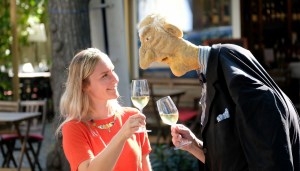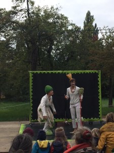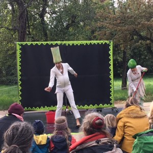 Nach dem grau verregneten Beginn des Radebeuler Weinherbst – angelehnt an das bisherige Herbst- und Weinfest & Internationale Wandertheaterfestival, das corona-bedingt nun unter anderem Namen und Konzept mit stadtweiten Veranstaltungsorten stattfindet – blieb es am Sonntag trocken und am späten Nachmittag schaute sogar die Sonne hervor und erfreute kleine und große Besucher noch mehr. Äpfel und Birnen, reichlich verstreut im Gras, verlockten zum Aufsammeln mit ihrem besonderen Aroma. Aus kleinen Zirkuswagen duftete es nach Kaffee und Kuchen. Die Wiese verwandelte sich in einen Abenteuerspielplatz für die Kinder. In der Theaterarena mit Strohballen als Sitzen auf der Streuobstwiese wurde erst mal ordentlich geschrubbt, bevor der Wischmob als Zepter geschwungen wurde für alle möglichen und unmöglichen Wünsche im Stück „Die Prinzessin auf der Erbse“ frei nach dem Märchen von Andersen. Dabei kommen sich ein Typ namens Erbse und eine Frau Linse, die gern Prinzessin wäre, immer wieder in die Quere in diesem witzig-clownesken Schau- und Puppenspiel von Flunker Produktionen. Er überlegt, was passiert, wenn die ganze Welt blau wäre. Wenn alle winken oder klatschen würden…