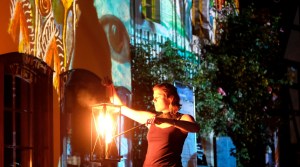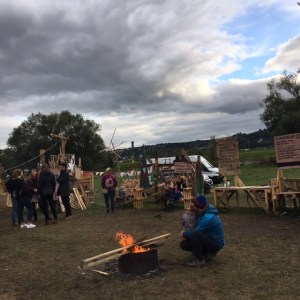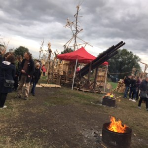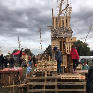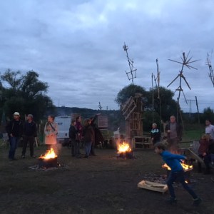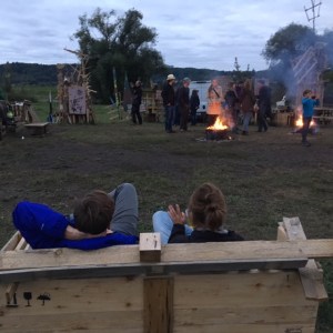 In eine eigene, fantasiereiche Welt lockte diesmal an Stelle des Labyrinths ein LABratorium mit Skulpturengarten auf der Elbwiese in Altkötzschenbroda, gestaltet von Richard von Gigantikow (alias Reinhard Zabka) und seinem Künstlerteam als Projekt des Kunst der Lüge e.V. Die Besucher wandelten auf einem fantastischen Weg durch hölzerne Skulpturen und Weisheiten, klein und groß konnten aus Holzpaletten selber etwas bauen und auf mit allerlei Getier und Fabelwesen bemalten Holzbänken verweilen, Musikanten lauschen und sich abends an Feuerschalen wärmen.