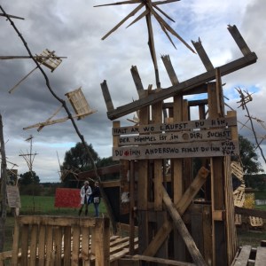 Auf einem Holzturm am Eingang stand: „Wir leben alle unter dem gleichen Himmel, aber wir haben nicht alle den gleichen Horizont.“ Ein paar Meter weiter ragten unter einem roten Zeltdach rostige Rohre wie Kanonen himmelwärts. Dazu der Spruch: „Der beste Dünger ist der Schatten des Gärtners.“