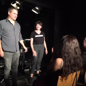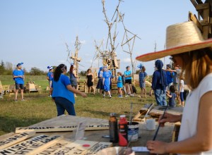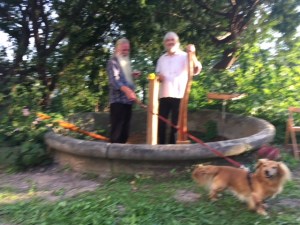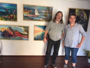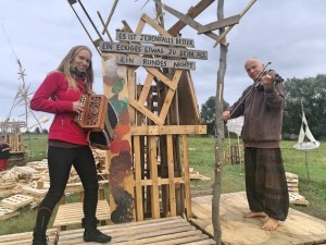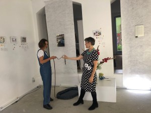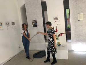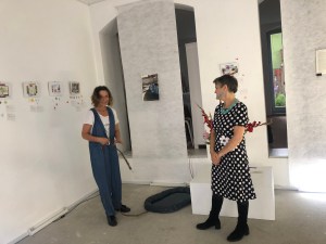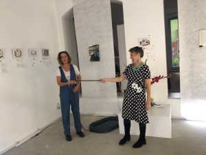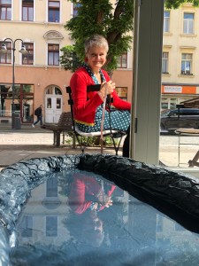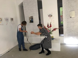 Kinder planschen gern durch Pfützen und entdecken darin die Welt wundersam verwandelt. Diesen Effekt nutzt die Künstlerin Sabine Eichler in ihrem Kunstprojekt mit ihrem Objekt „Pfütze“, auf einem Handwagen an der Leine ist sie damit unterwegs und hält dabei entstehende Begegnungen, Spiegeleien und neue Selbsterkenntnisse mit anderen Menschen in Fotografien und Videofilmen fest. Zurzeit ist sie zu Gast im Atelier von Kati Bischoffberger. Beide Künstlerinnen hatten viel Spaß wie man sieht – die „Pfütze“ steht für Offenheit, Fantasie, ist ein Mittel zur Kommunikation und bringt Menschen zusammen. Text + Fotos (lv)
