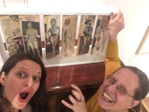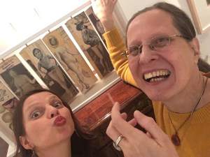 Kunst in Bewegung. Die drehbaren Objekte in der Ausstellung laden ein zum Bespielen und auch Posieren, um dem nackten Wahnsinn in diesen ver-rückten Zeiten Ausdruck zu verleihen. Da hilft nur Humor, Zuversicht und locker bleiben. Wie hier zu sehen: Galeristin Janett Noack und Lilli Vostry, freie Journalistin und meinwortgarten.com-Inhaberin.