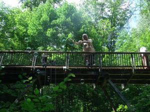 Gab es so noch nicht und reizt Regina Felber daher um so mehr. Der Wald als Zufluchtsort, Ort der Geheimnisse, Träume und Visionen spielt außerhalb der Bühne und Stücken wie etwa Shakespeares „Sommernachtstraum“ bisher kaum eine Rolle. Das Kunstprojekt „Luftholen“ lädt die Besucher zum Gehen und Schauen, Hören, Verweilen und Lustwandeln im Freien ein. Insgesamt 15 Künstlerinnen und Künstler agieren zum Thema Luft und Wald an zehn Spielorten. „An der Pergola, dem Eingang zum Waldpark an der Stechgrundstraße wird das Publikum begrüßt, mit einem kulinarischen Lunchpaket und Getränk von Feinkost Müller vom Weißen Hirsch für das Waldpicknick versehen und in Gruppen von 30 bis 45 Personen von den Künstlern ins `Wald-Theater` begleitet“, so Regina Felber. Sie ist die Theaterdirektorin und spielt eine Figur, die vom Home Office weg will.