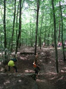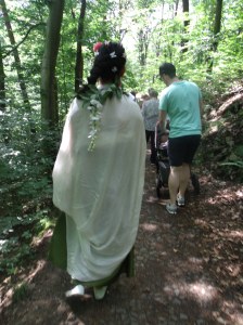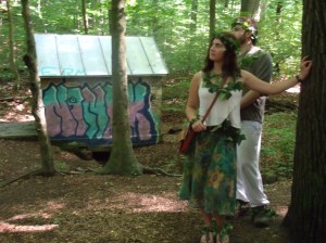 Die Natur spielt mit: Eine fantasievolle Figurenschar um die Schauspielerin und Regisseurin Regina Felber (im Hintergrund) lockt zum Wald-Theater.