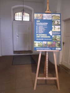 Auf einer Staffelei im Foyer vom Kavaliershaus steht das Plakat mit je einem Werk aus der Ausstellung. Ein farben- und facettenreicher Bilderbogen in verschiedenen künstlerischen Techniken erfreut das Auge. Darunter sowohl beliebte Motive der Elbe- und Lößnitzlandschaft als auch Blicke auf unbekannte Ecken und Sehenswürdigkeiten aus besonderer Perspektive eingefangen. Mechthild Mansel geht seit einigen Jahren mit ihren VHS-Kursteilnehmern im Areal der Hoflößnitz nahe der Weinberge und den zahlreichen Motiven ringsum malen. „Das wäre ein passender Ort für die Bilder meiner ambitionierten, fortgeschrittenen `Hobby-Maler`“, dachte sie sich.