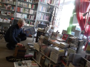 Inmitten der Bücherregale stehen einladend ein Stuhl und ein Tisch mit Leselampe und dem neuesten Lesestoff. Davor liegen kleine Bücherstapel mit liebevoll illustrierten Kinderbüchern und Romane auf einer Decke bereit. Diese bringt Jörg Scholz-Nollau, Inhaber der Buchhandlung „LeseZeichen“ zu den Lesern auf Wunsch an die Haustür.