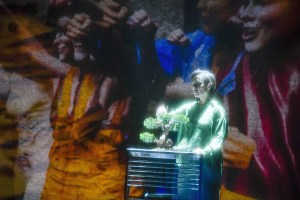 Auf die Bühne kam das Szenario einer Dystopie mit abwechselnd grotesk-komischen, düsteren und beklemmenden Videobildern und Szenen (Videoprojektion: Victor Morales) mit endlos scheinenden Krankenhausfluren, blutrot aufleuchtenden Lämpchen, unheilvoll kreisenden schwarzen Vögeln am Himmel und Avataren, künstlich-menschlichen Mischwesen mit bizarren Maskengesichtern auf der Leinwand.