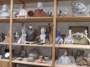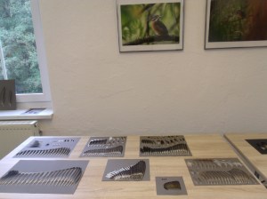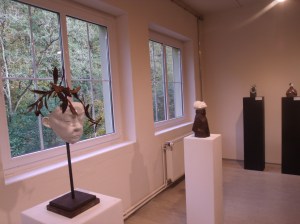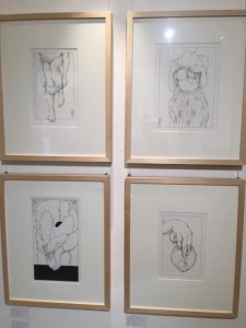 Schön ironisch ihre schwarzen Tuschezeichnungen zum Thema „Verhüllung“ mit körperlicher Ver- und Entkleidung, die schon mal zur „Sockosophie“ werden kann bis zur Maskerade mit Unterhose und drei kleinen Ölbildern mit aufreizend roter „Schnute“. Eine Hand hält ein Herz – frei und ungeschützt.