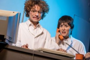 Die Bühne ähnelt einem Versuchslabor mit allerlei Gerätschaften, Kaffeemaschinen und rot flimmernden Lämpchen. Dazwischen eilt ein Mann mit Wuschelfrisur, verschmitztem Blick und weißem Kittel umher, zeigt seine Wunderwelt und wie sie entsteht: die „Pointenschleuder“, den “Gagomat“, die „Spaßbremse“ und einen „Brutkasten“, in dem neue Ideen reifen. „Komik entsteht aus Konflikten!“, erklärt der Humorforscher Professor Thalius (Christian Kühn). Und seine Assistentin Betty Eureka (Dorothea Kriegl) findet „ein wenig Anzüglichkeit gar nicht verkehrt“.