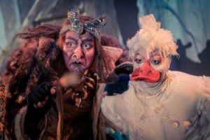 Märchenspaß für klein und groß: Hexe Baba Jaga und Weihnachtsgans Auguste, die als Lieferdienst angeflogen kommt und eine tragende Rolle im Hexenhaus spielen soll.