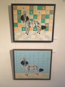 Der Ausstellungstitel klingt trocken sachlich, auch mit leiser Ironie und kontrastiert mit den farb- und formreichen Bildwelten. Heitere Farbtöne wechseln mit militärisch braun-grün gefleckten Farben in der Bilderserie „Hageltarn“ aus dem Jahr 2003. Da sieht man „Esel bei der Marslandung“ als Kosmonaut, „Esel als Falkner“ und „Spieler“ vor entsprechend gemusterter Tapete in Wohnräumen. „Tiere erleben sich über Menschen“, kommentiert Markus Johne. Er sah selbst schon Wölfe auf Brachflächen und ehemaligen Truppenübungsplätzen. Ein Wolf schleicht vor dem Braunkohlekraftwerk Boxberg mit rauchenden Schloten, kargem Boden und ein paar kleinen Kiefern vorbei auf dem Titelbild der Ausstellung. Verdutzt und aufmerksam schaut er den Betrachter an. Der Wolf steht für die Härte und den Überlebenskampf der Natur und ihrer Geschöpfe, aber auch für das Wilde, Freie.