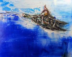 Ein Mensch sitzt auf einem Riesenfisch oder einer Flaschenpost. Wohin? Hauptsache woanders sein.