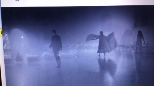 Traumversunkene Gestalten erscheinen mal im Halbdunkel und mal im gleißenden Licht, sie stehen in der Gruppe mit Abstand oder gehen einzeln umher, suchende Blicke… Stumm oder leidenschaftlich südländisch Wut, Schmerz und Trauer herauslassend. Ein Mann fällt auf die Knie und hält sich die Hand vors Gesicht, während er weiter das Fluchen seiner Frau hört.