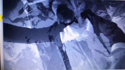 Der Höhepunkt der Aufführung, die Sterbe- und Geburtsszene ist gegen 2 Uhr zu sehen. Man hört Schmerzensschreie. Sieht eine schwarze Gestalt wie durch ein Schlüsselloch, die mit dem Tod ringt, umfällt und auf dem Rücken wie ein Neugeborenes zappelt mit Armen und Füßen…. versucht aufzustehen, immer wieder hinfällt und unter Mühe sich aufrecht. Ein Gleichnis für den menschlichen Existenzkampf beeindruckend mit intensivem Körpertheater gespielt von Simon Werdelis. Nackt steht er im Raum …. ein anderer Mann im Anzug liegt auf dem Bett, das sich dreht wie in einem Albtraum, er schreit und lauter nackte Figuren stürzen aus der Höhe herab stürzen… Victor Tremmel spielt den verzweifelten Träumer großartig. Als die letzten Traumbilder über den Bildschirm vom PC flimmern, wird es draußen schon hell, begleitet von Vogelzwitschern. Vielleicht sehen wir uns gleich in einem anderen Traum wieder.
