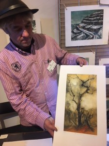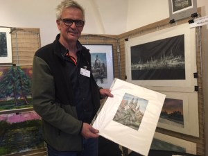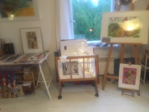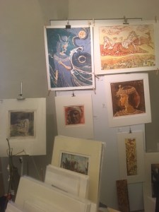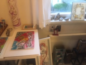 ganz neu und Dorothee Kuhbandner nahm sie mit zum Meißner Grafikmarkt am vergangenen Wochenende. Außerdem ist sie mit ihren Arbeiten beim 44. Radebeuler Grafikmarkt am 6. November dabei. Die Wände strahlen in frischem Weiß wie der Fußboden in ihrer „bunten Stube“, wie sie den Raum nennt, in dem ihre eigenen Bilder hängen. „Dorealismus“ nennt sie dieses farbenfroh fantasiereiche Universum in ihrem unverkennbar eigenen Stil. Luftiger, weiter und klarer wirkt der Raum jetzt. In einer Ecke steht immer noch der kleine Kaminofen, Sessel, Tisch und Stühle für Gäste bereit. Und das hereinfallende Sonnenlicht lässt ihre ohnehin farbreichen Bilder noch mehr leuchten. In weiteren zwei Räumen zeigt Dorothee Kuhbandner die Werke anderer Künstlerinnen und Künstler in wechselnden Ausstellungen in der Galerie mit Weitblick auf der Oberen Bergstraße 13 in Radebeul.