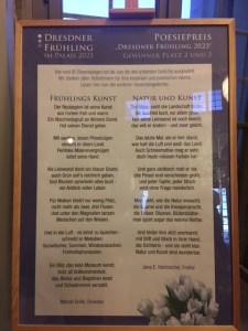 Ich bin als Freie Journalistin (Wort/Foto) seit 1992 in Dresden tätig. Schreibe für Tageszeitungen und Monatsmagazine vor allem Beiträge über Bildende Kunst, Theater, soziale Projekte und Zwischenmenschliches. Außerdem Lyrik und Kurzprosa. Bisher vier BilderGedichtKalender zusammen mit Künstlern veröffentlicht. Fernstudium Literarisches Schreiben im Herbst 2022 erfolgreich abgeschlossen, Schriftstellerdiplom. Kindheitstraum erfüllt. Fotografiere gern Menschen, Landschaften, besondere Momente.