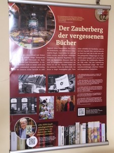 Die Ausstellung „Leseland DDR“ geht dem Wert von Büchern und Literatur im Spannungsfeld von Realismus contra Realität nach. Bevor die „Wunderbaren Jahre“ und „Märchenwelten“ dazumal in der Dokumentation noch einmal aufleuchten, erzählt „Der Zauberberg der vergessenen Bücher“ gleich auf der ersten Tafel vom Ende des Leselandes DDR. Mit Fotos von Bücherbergen in Containern, weggeworfen mit dem Untergang der DDR. Ein Student durchwühlt einen davon und hält einige Bücher in der Hand. Traurig und dramatisch beschrieben, wie die Leute auf wacklige Leitern steigen, um an die obersten Regale zu gelangen und unter Lebensgefahr die plötzlich wertlosen Bücher zu holen. Ironie der Geschichte. Ein Saal voller Bücher aus der DDR, aufbewahrt in der Bibliothek von Peter Sodann und Antiquariat im sächsischen Staucha im Landkreis Meißen. Der Schauspieler, Kabarettist und Theatermacher rettete viele. In reichlicher Auswahl begleiten sie die Ausstellung, viel gelesene und diskutierte Bücher z.B. von Andrej Platonow „In der schönen und grimmigen Welt“, Ulrich Plenzdorf „Die neuen Leiden des jungen W.“, Landolf Scherzer „Der Erste“, Christa Wolf „Kindheitsmuster“ und Kurt Schwitters „Anna Blume und andere“.
