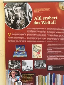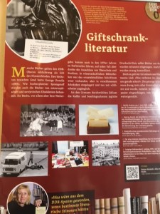 Weitere Tafeln zeigen beliebte Kinderbücher wie „Alfons Zitterbacke“, Science Fiction-Literatur, Krimis, Kochbücher, schwer erhältliche Bücher mit brisantem Inhalt, so genannte „Giftschrank-Literatur“ künden von der Macht des Wortes, die Leipziger Buchmesse lockt viele als „Fenster zur Welt“ und die Frage nach „Zwei deutschen Literaturen?“ wird gestellt. Der erste Deutsche im Weltraum, der DDR-Kosmonaut Siegmund Jähn hatte 1978 eine dreibändige Miniaturausgabe von Goethes „Faust“ im Reisegepäck. Laut einer Besucherbefragung bekam 1983 nur noch jeder sechste Kunde seinen konkreten Kaufwunsch erfüllt vom Volksbuchhandel im „Leseland DDR“. Gefragte Titel waren meist nur unter dem Ladentisch mit „guten Beziehungen“ zum Buchhändler erhältlich. An der Spitze stand Alexander Wolkow, gefolgt von Karl May, Avery Corman, Èmile Zola und Maxi Wander. Stefan Zweig kam auf Platz neun, dicht gefolgt von Franz Kafka und Hermann Hesse.
