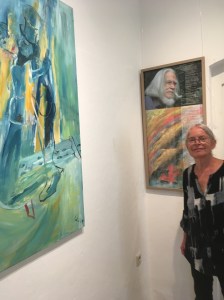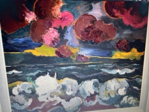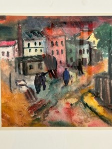 Expressiv farbige, pastose Landschaftsmalerei mit tiefroten Wolkenhimmeln und aufgewühlten Wellen an der Nordsee neben wogenden gelben Getreidefeldern und Blicken auf die Dresdner Vororte Goppeln, Strehlen und Prolis noch ohne Hochhäuser in den 20er Jahren. Herausragend einige figürliche Arbeiten. Darunter die Tanzpaare, elegant gekleidet in schwarzem Frack die Herren und die Damen mit großen, dunkel umrandeten Augen und roten Lippen in weißbleichen Gesichtern, die im Ausdruck an Otto Dix erinnern. Daneben ein Porträt einer Arbeiterfrau, grau und staubig ihr Gesicht und die Bluse vor dunklem Hintergrund, im Haar und Augen ein paar sehnsuchtsvolle Grünschimmer. Zu sehen sind außerdem farbige Zeichnungen mit Frauenakten, Badenden und ein Paar am Strand. In der Art der Brücke-Künstler erdfarbene Körper in bewegten und kantigen Formen. Maler und Modell, groß ihre Reize im Bild und er an der Staffelei pinselschwingend, in einer Tuschezeichnung festgehalten.