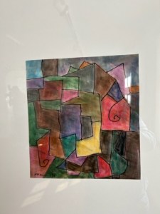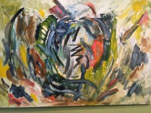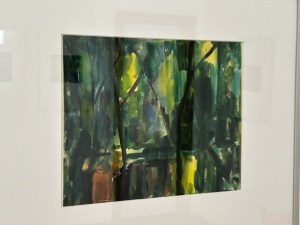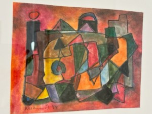 Zeichenhaft, geometrisch, konkret, gekleckselt und expressiv farbig. Kein Bild ist wie das andere bei Hans Christophs. Ein vielfältiges Oevre wie ein Gang durch die Kunstgeschichte begegnet dem Betrachter. Vieles kommt einem bekannt vor, in dem das Eigene, Prägnante, Unverkennbare des Künstlers allerdings etwas untergeht. Seine Werke zeigen einen Tausendsassa der Farben und Formen in beeindruckender Vielfalt und offensichtlichem, lebenslangen Drang und Freude an immer neuen Ausdrucksformen. Zu sehen ist auch eine Schwarz-Weiß-Fotografie von Edmund Kesting von 1948 mit einem modern und zeitlos wirkenden Porträt Christophs, konkret und abstrahiert im Profil, mit offenem Blick und Zeichenstift vorm Gesicht. Da hängen abstrakte, informelle, farbreich gekleckselte Ölbilder, Goauchen und Collagen mit geometrischen Formen, fliegenden Pfeilen und Schwertlilien vor Stacheldraht nebeneinander.
