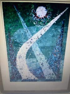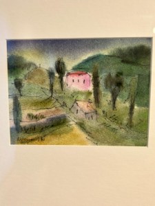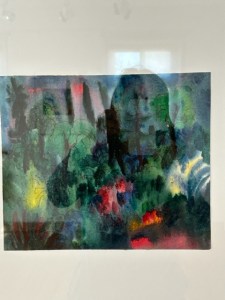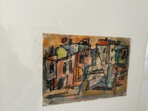 Luftig-leicht und prägnant sind auch die Buntstiftzeichnungen, die originell bekannte Malmotive aufnehmen und weiterführen. Darunter zu einem Bild von Vermeer, in dem ein Mann mit breitkrempigem Hut und Umhang und eine Frau im roten Kleid am Tisch sitzen. Ein Stilleben mit Früchten und Ornamenttischdecke leuchtet südlich heiter neben drei Mädchen mit Tauben, im grellen, gelbfahlen Licht, schattenhaft umherirrenden Gestalten zwischen dunklen Trümmern und zwei Frauen am Fenster vor rotgefärbtem Himmel. Im letzten Ausstellungsraum treffen nochmals sehr eigenwillige, formspielerische und farbenfrohe Aquarelle aufeinander: Fische, die neben Netzen und Wasserpflanzen umer springen. Eine Mondlandschaft und Blumen zwischen Sternen und einer blauen Katze am Fenster. Das Ölbild „Weesenitzmühle“, um 1932 gemalt, mit seiner Landschaft in wellig fließenden und kugeligen Formen ist ein ebenso klares wie poetischen Sinnbild für Bewegung und Wandel in der Natur und im Leben.