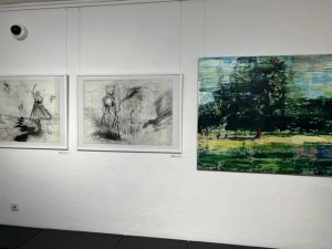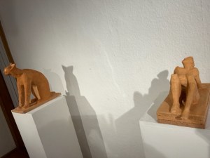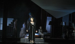 Spannend die Szene, als die zwei Frauen und Rivalinnen sich dann endlich gegenüberstehen als dramatischer Höhepunkt in Schillers Stück. Denn im echten Leben sind die beiden Königinnen sich nie begegnet. Elisabeth staunt, dass sie keine gramgebeugte Frau vorfindet, sondern Maria Stuart ihr stolz, schön, klug und aufbegehrend gegenübertritt. Sie steht mal zwischen den Pfeilern einer Regalwand, in der Hocke, richtet sich wieder auf und steckt ihren Kopf durch ein Dreieck in der Wand. Geht hindurch und steht in ihrem schwarzen, weiß durchlässigen Kleid im Licht mit dem Rücken zur Wand. Elisabeth in Kostümjacke, Hosen und Stiefeln kommt gerade von der Jagd, sieht neugierig, ergriffen und wütend zugleich auf ihre Gegnerin, die kein bisschen unterwürfig ist und sie herausfordert. Es gibt keine Versöhnung!, ruft die Stuart ihr entgegen. All ihr Zorn und Leidenschaft über die lange Gefangenschaft und Unrecht brechen aus ihr heraus. Maria glaubte, dass sie sich wie zwei Königinnen auf Augenhöhe begegnen könnten. Doch zu viel ist schon geschehen und beide Frauen können nicht an sich halten, keine der anderen trauen oder um Schutz bitten. Das ist die Tragik dieser Geschichte und visionäre Botschaft des Stücks, dass dies eines Tages doch möglich wird, dass zuerst die Herzen und Mitgefühl sprechen statt Gewalt, Gegensätze und Feindseligkeiten.