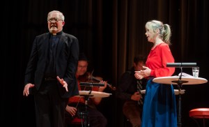 Aus einem übergroßen, aufklappbaren Reisekoffer, ihrem Gefängnis mit karger Einrichtung, tritt Maria Stuart (stolz, unverzagt und kraftvoll: Karoline Günst) heraus und setzt sich obendrauf, rebellisch, fast übermütig und fragt, ob sie schon verurteilt ist. Ihre Amme (gütig und großherzig: Anke Teickner) beruhigt und tröstet sie und trägt eine Geige mit sich, als wiege sie ein Kind. Die wird Maria später spielen, in Momenten der Liebe und größter Bedrängnis. Drei Musiker (Berthold Bauer, Kevin Knödler und Simeon Hudlet) begleiten außerdem das Geschehen und lockern es abwechslungsreich auf mit Trompete, Kontrabass und Gitarre, mal leise, wehmütig, mal rockig, bluesig und feurig wie Flamencoklänge. Wenn Maria Stuart aufbegehrt und ungeduldig auf und ab gehend auf Königin Elisabeth wartet. Das ist lang, zäh und erfordert viel Zuhör- und Durchhaltevermögen auch von den Zuschauern, bis die Handlung an Spannung gewinnt und die Geschichte einen packt und ergreift. Es wird viel geredet, palavert und gestritten in langen, wortreichen Mono- und Dialogen in dieser dreistündigen Inszenierung unter Regie von Landesbühnenintendant Manuel Schöbel. Maria glaubt an das Gute, Wahre und Schöne bis zuletzt. Doch als lebensfrohe wie gläubige Katholikin ist sie der protestantischen Königin Elisabeth (kühl kalkulierend: Julia Vincze) suspekt. Da die Stuart auch noch selbst den englischen Thron beansprucht, stellt sie eine Gefahr dar für Elisabeth. Ihre Gefolgsleute unternehmen alles für ihren Machterhalt und verfolgen eigene Interessen, die einen mit Intrigen, andere diplomatisch, sachlich oder versuchen Elisabeth von den Vorteilen einer Ehe zu überzeugen.