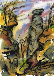 Fremdes, Nahes und Vertrautes mischen sich in den Bilderlandschaften von André Uhlig. Die Suche und Sehnsucht nach Naturidylle, ursprünglichem Verwurzeltsein und Erleben spiegeln seine Arbeiten eindrucksvoll und stimmungsreich. Sie hängen auch teils versteckt an den Wänden hinter den Bücherregalen im Erdgeschoss und im Veranstaltungsraum in der ersten Etage. Da führt eine Treppe zu einem alten Weinberg zwischen Bäumen hinauf in einer farbigen Aquarellzeichnung mit Tusche und Kohle. Da leuchten die Weinhänge der Lößnitz in hellen, sonnigen und erdigen Farbtönen und darüber große weiße Wattewolken am graublauen Himmel. Da brechen in grellen und düsteren Farben gehalten „Stürmische Zeiten“ an, ragen enge Felsschluchten auf, geht es „Bergauf“ zu einem still verträumten Gehöft auf lichtvollem Grund, wächst ein Baum auf einer Felsklippe „Am Abhang“. Der „Winter im Tal“ trifft auf die „Blaue Stunde am Rosenberg“. Am Fluss überrascht auffliegende, kreischende Möwen sind zu sehen neben hoch über Feldern am lichten Himmel kreisenden schwarzen Vögeln. „Aufbruch“ heißt diese Farbgrafik/Sandreservage und trägt schon einen roten Verkaufspunkt. In Uhligs Bildern verbinden sich verschiedene Naturstimmungen, Schönheit, Erhabenheit und Gefährdung.